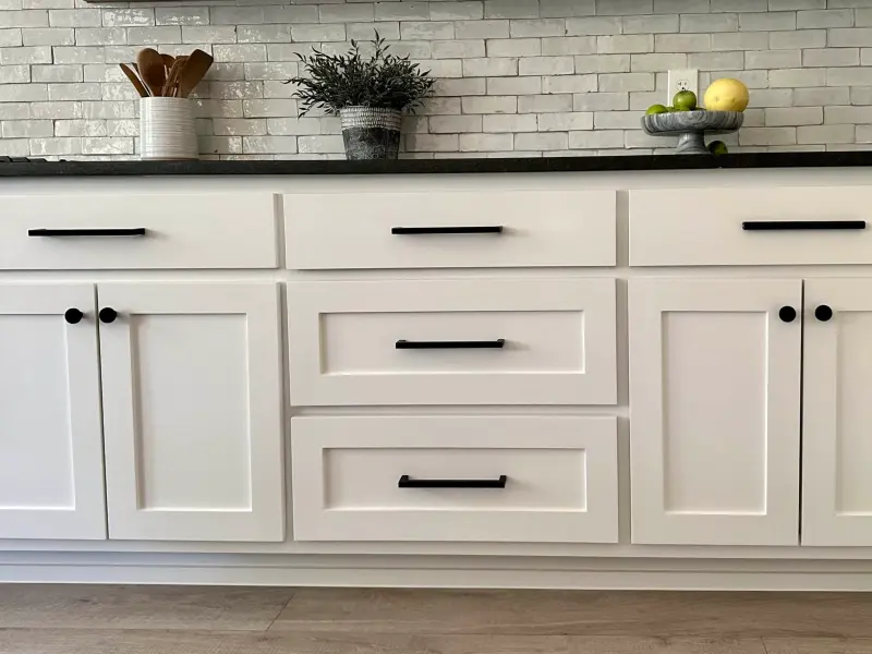 Cabinet hinges and drawer slides are the most important because they affect daily use.